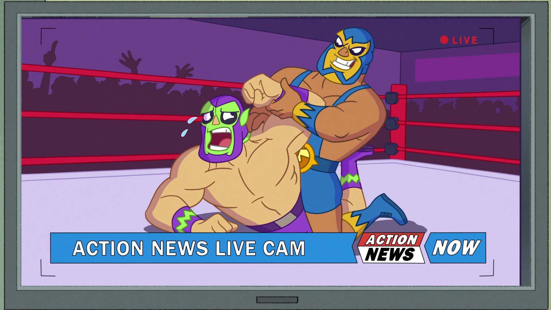 "The Litigator vs. The Luchador" opens with El Luchador in prison, escaping it after lying to a guard that he cannot whistle, and promptly beating him up using his Acute Angle Tangle and taking his clothes. He has left a variety of clues that indicates here he's going; these being several flyers for the Professional League of Wrestling Tag Team Championship match that will occur later that day, and a map of the city, with many arrows drawn on it that point towards the location of the arena where said wrestling match will be held. Despite these clues, no one at Action News, let alone reporter Veronica Hill, knows where El Luchador could be. Hamster, Gretel and Kevin, however, correctly deduce that El Luchador wants to intervene the PLOW championship match and take the belt for himself, desiring to win all of his belts back.