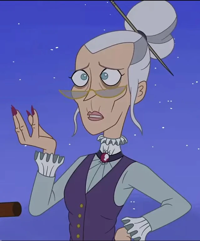 The Librarian is an older woman with an 18th century style wardrobe. She wears a slate, long sleeved, ruffle-cuff blouse with white frills on the neck and wrists, as well as a navy blue waistcoat. She also wears halfmoon reading glasses with yellow frames. The Librarian also uses a hair stick to keep her white hair up in a crown bun. She has talon-like red fingernails.