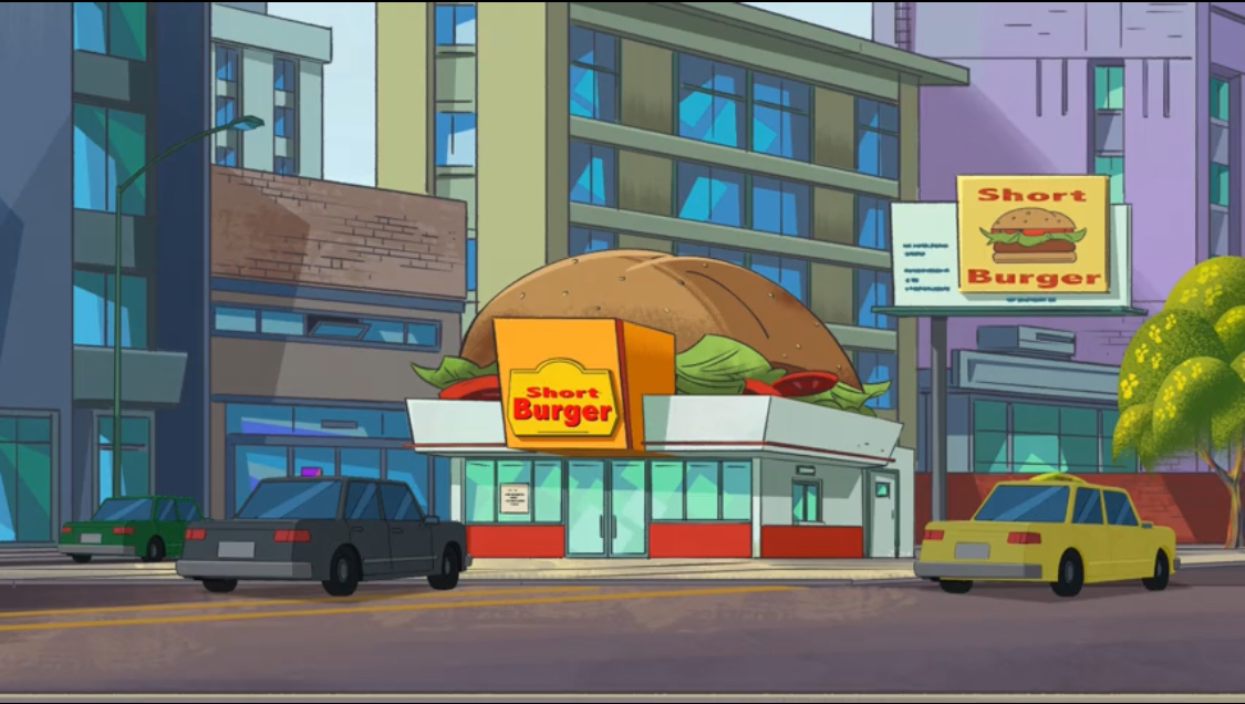 Short Burger was a fast-food burger establishment from the episode "Micromanager". The restaurant established itself as a fierce rival to the neighboring Tall Burger, complete with its motto being "Tall Burger must be destroyed", as its founder, Micromanager, used to work at Tall Burger as Joe before accidentally shrinking himself and being fired for being difficult to work with. The restaurant commonly hired teenagers and encourages rivalries between them to ensure work is being done to outdo Tall Burger, with Micromanager keeping his appearance concealed from them as he ordered his employees around through intercom, only calling them by number rather than name. Unbeknownst to said employees, the establishment was also used as a front to construct parts of a giant robot suit which Micromanager planned to literally destroy Tall Burger with, his ultimate goal.